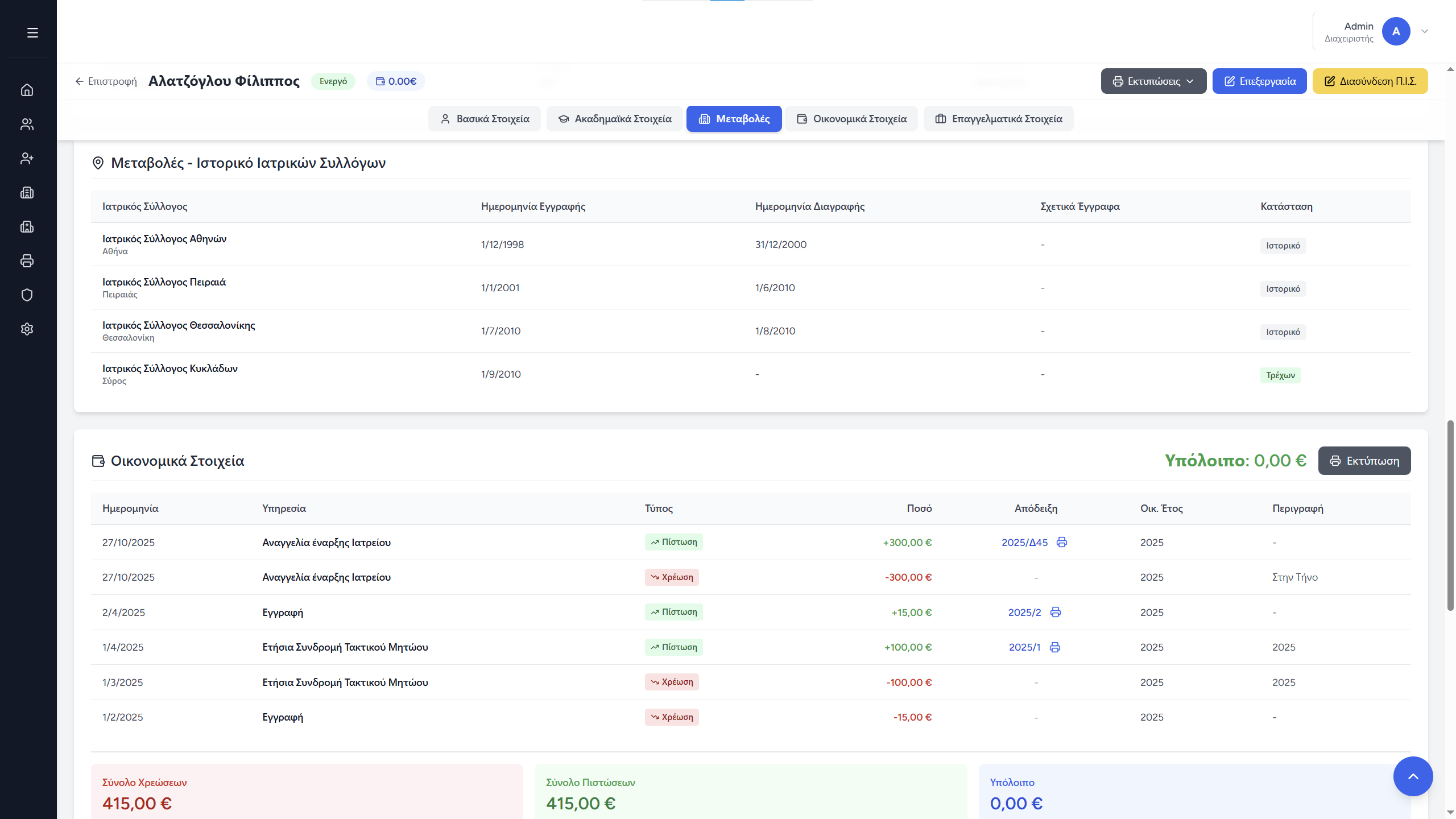 Διαχειριστείτε μέλη, ειδικά μητρώα, εταιρείες, Δομές Π.Φ.Υ. και οικονομικά — με αυτοματοποιημένες χρεώσεις και έκδοση αποδείξεων, έκδοση επίσημων βεβαιώσεων σε PDF και ποικιλία στατιστικών.